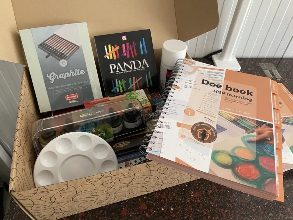 - Werkboek+kunstzinnig materialen pakket( o.a pastel, was, aquarel, kleur-en tekenpotloden)